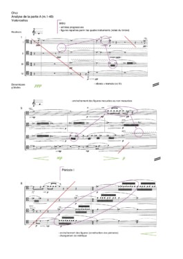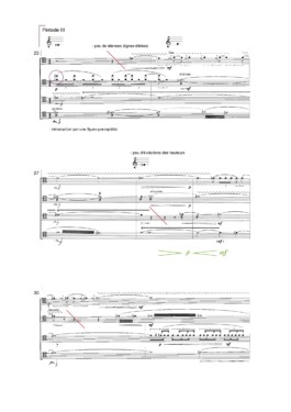 The periods have a profile resembling the lines, but in the order of the nuances and the dynamism of the figures, enchained by more or less static intermediate transitions, which translate in instrumental writing by an evolution of the figures and dynamics according to the same principle.